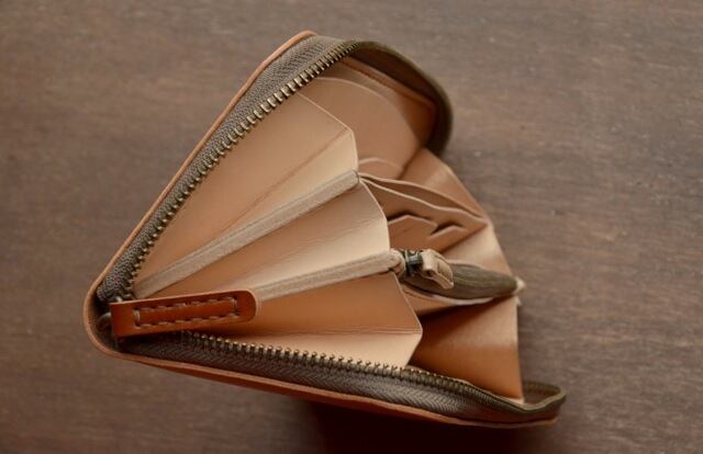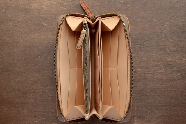 外装の革はキャメル(黄土色)で内装はプレーン革(染め無し革)です。